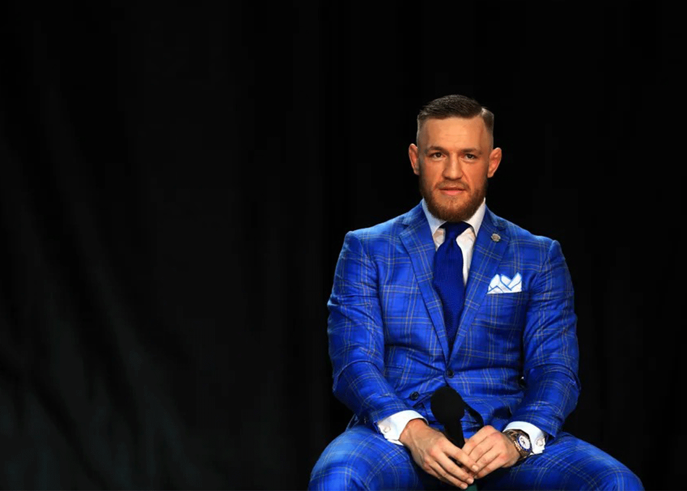 McGregor favours the traditional three-piece suit, not that we’d argue with him on that. This grey three piece features a subtle Prince of Wales check, vastly improved by the addition of a purple tie and pocket hankie.
