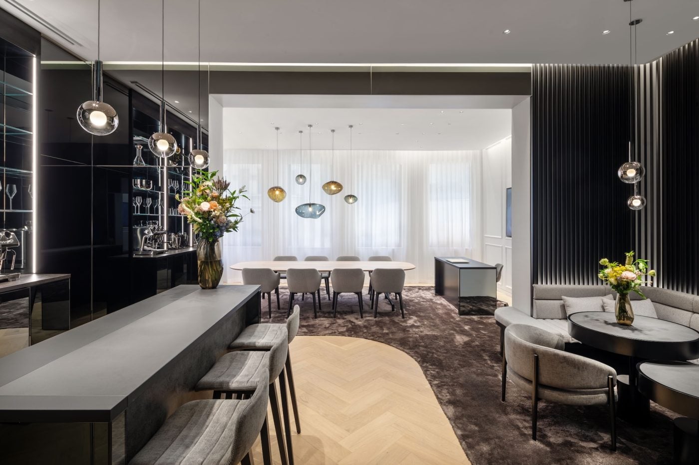 The second floor is where it gets properly impressive. This is VIP territory: custom banquette seating, a long bar counter, and what Lange calls its Experience Library. A salon-style space with curated artworks, rotating exhibits, and reading materials tracing the brand’s history.