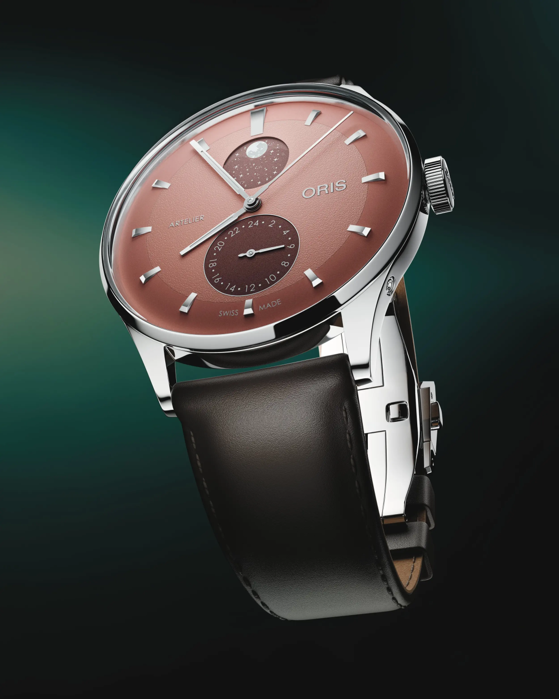 The dial is clean, the chapter ring is smooth, and the scalloped moonphase aperture extends into a field of stars that’s the best Oris detail in years. Three dial colours: ivory, midnight blue, and chestnut. On strap or bracelet.