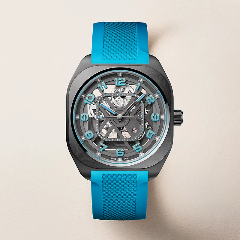 60-hour power reserve, 100m water resistance, and a 10-year warranty that’s a bold move from any brand. Available in blue or grey marker configurations. The H08 has been quietly building a following since 2021, and this skeleton version is the most technically ambitious thing Hermes has done with the collection.