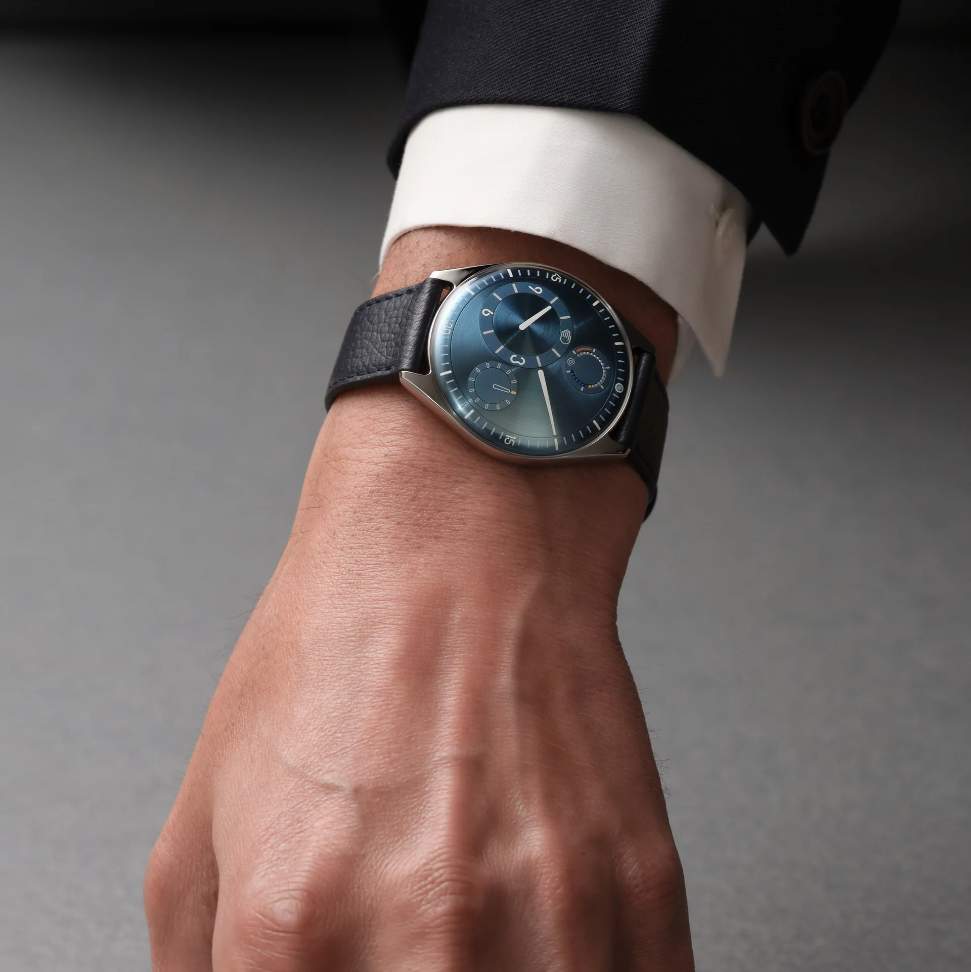 A chronograph that only exists when you need it. Five coaxial hands sit perfectly stacked on a mineral blue grain d’orge guilloched dial until you hit the monopusher at 7:30. Then three rhodium hands deploy across the full dial to measure elapsed time.