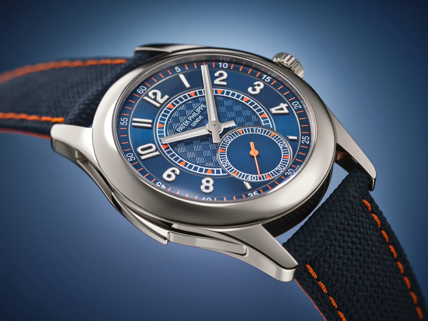Patek put a minute repeater in a sporty 38mm white gold Calatrava with a navy blue carbon-textured dial and orange accents on the seconds hand, triangle markers and strap stitching.