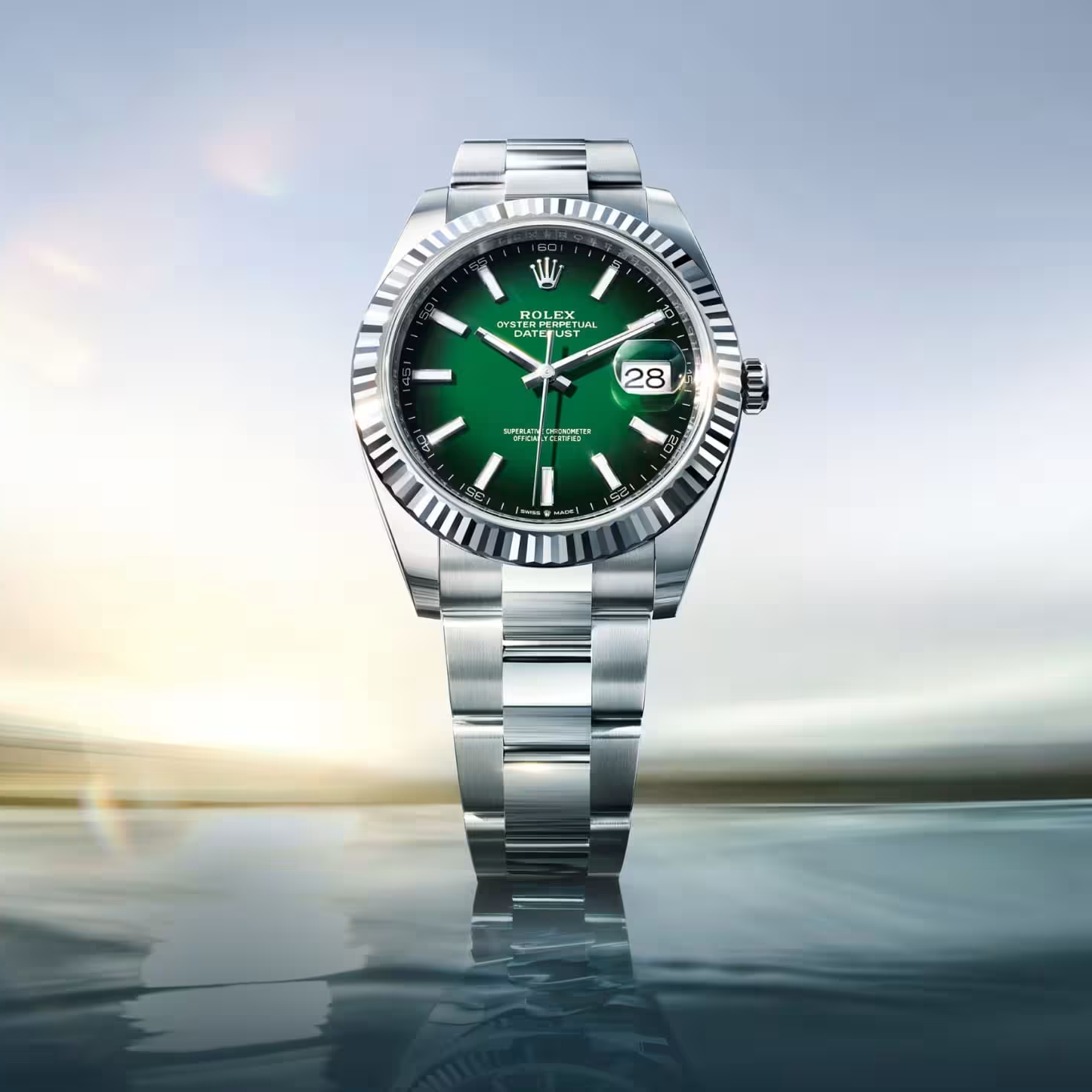 Rolex brought the ombre lacquer treatment down from the Day-Date to the Datejust 41 for the first time. Green lacquer base with black lacquer sprayed concentrically toward the edges, creating a smoky gradient that looks vintage and modern at the same time.