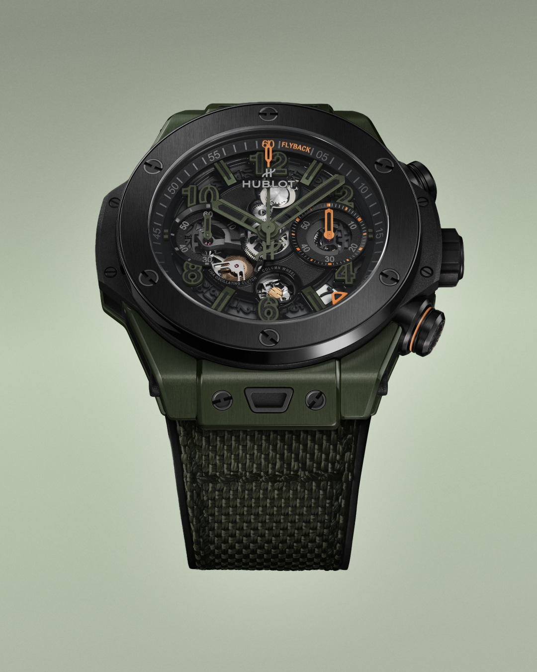 Hublot rebuilt the Big Bang from the inside out for its 20th anniversary. New HUB 1280 UNICO manufacture movement, 44mm case, flyback chronograph with column wheel. Five core references span titanium ceramic, blue ceramic, dark green ceramic, all black and Magic Gold.