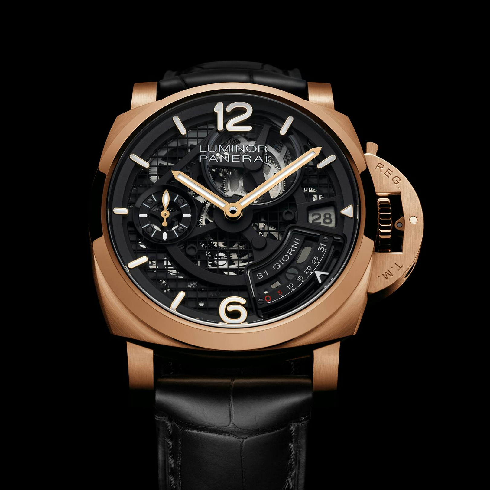 A Luminor that runs for 31 days on a single wind. The Goldtech case houses a skeletonised movement with a massive power reserve indicator counting down from 31 to zero, and the whole thing is based on the 1960s Ref. 6152/1 that started Panerai’s cult following.