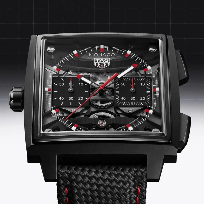 Developed with Vaucher, the Calibre TH80-00 reduces the chronograph to its absolute mechanical essentials. Black titanium case, skeletonised dial, red accents. The standard Monaco also got a complete overhaul with a new in-house Calibre TH20-11 in three colourways. Both are 39-40mm. Both are in titanium for the first time.