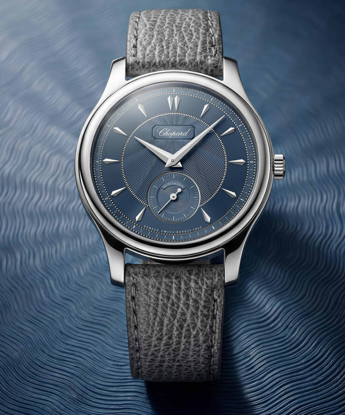 Chopard marks 30 years of in-house watchmaking by reviving the watch that started it all. 36.5mm Lucent Steel case, a hand-guilloched “Areuse Blue” dial in 18-carat white gold finished on a vintage lathe by in-house artisans, and the Calibre 96.40-L micro-rotor with twin barrels and 65 hours of power reserve. No date window. COSC and Poincon de Geneve certified.