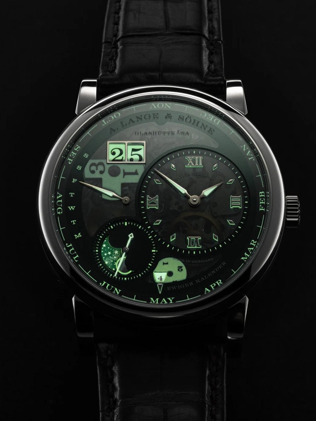 The best watch at the fair and it’s not particularly close. Lange combined its two signature grand complications for the first time under a tinted sapphire dial, and the result is a 685-part mechanical aquarium that glows green in the dark. Every perpetual calendar display is luminous. The outsize date numerals light up.