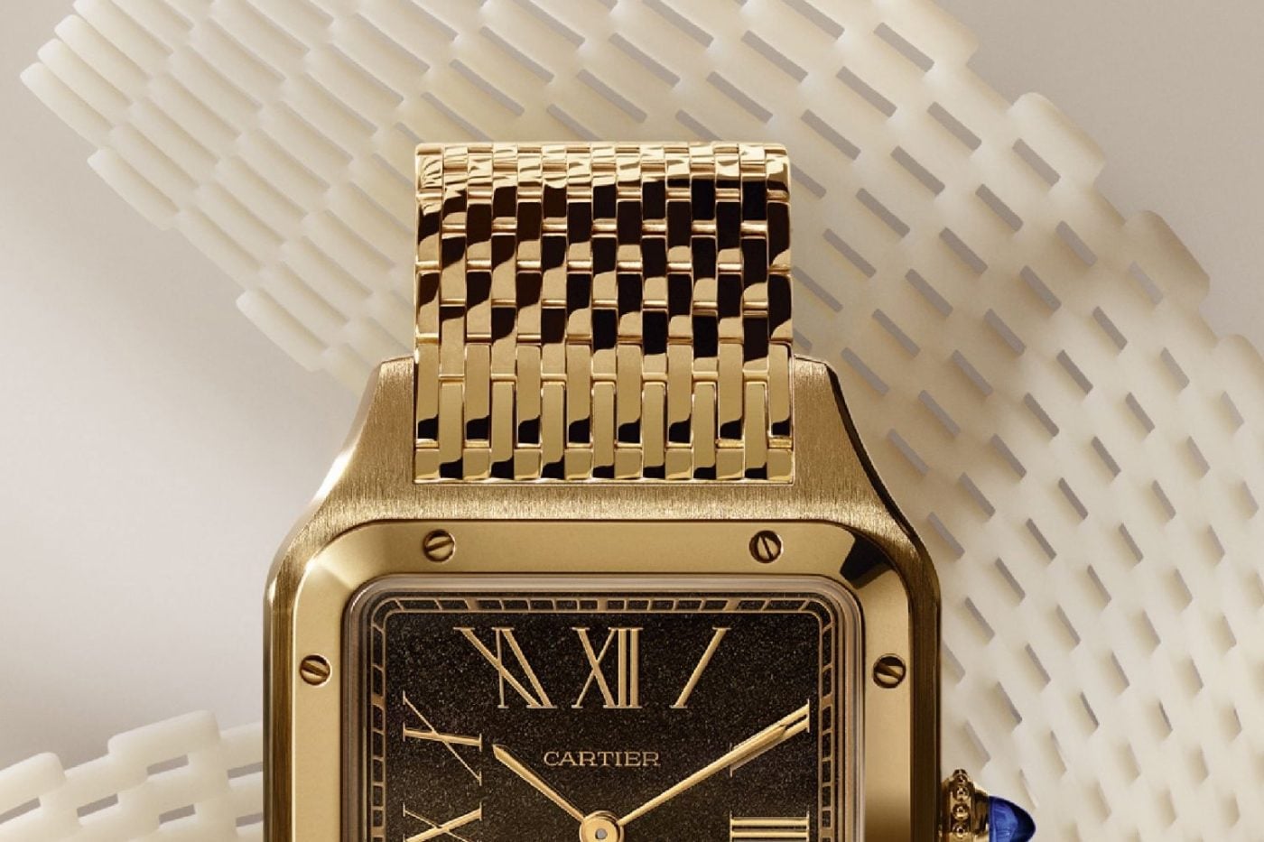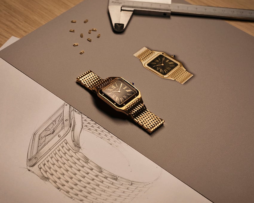 It’s inspired by Cartier’s own 1920s made-to-measure metal bracelets and gives the Santos-Dumont a vintage warmth that the leather-strap versions can’t match.
