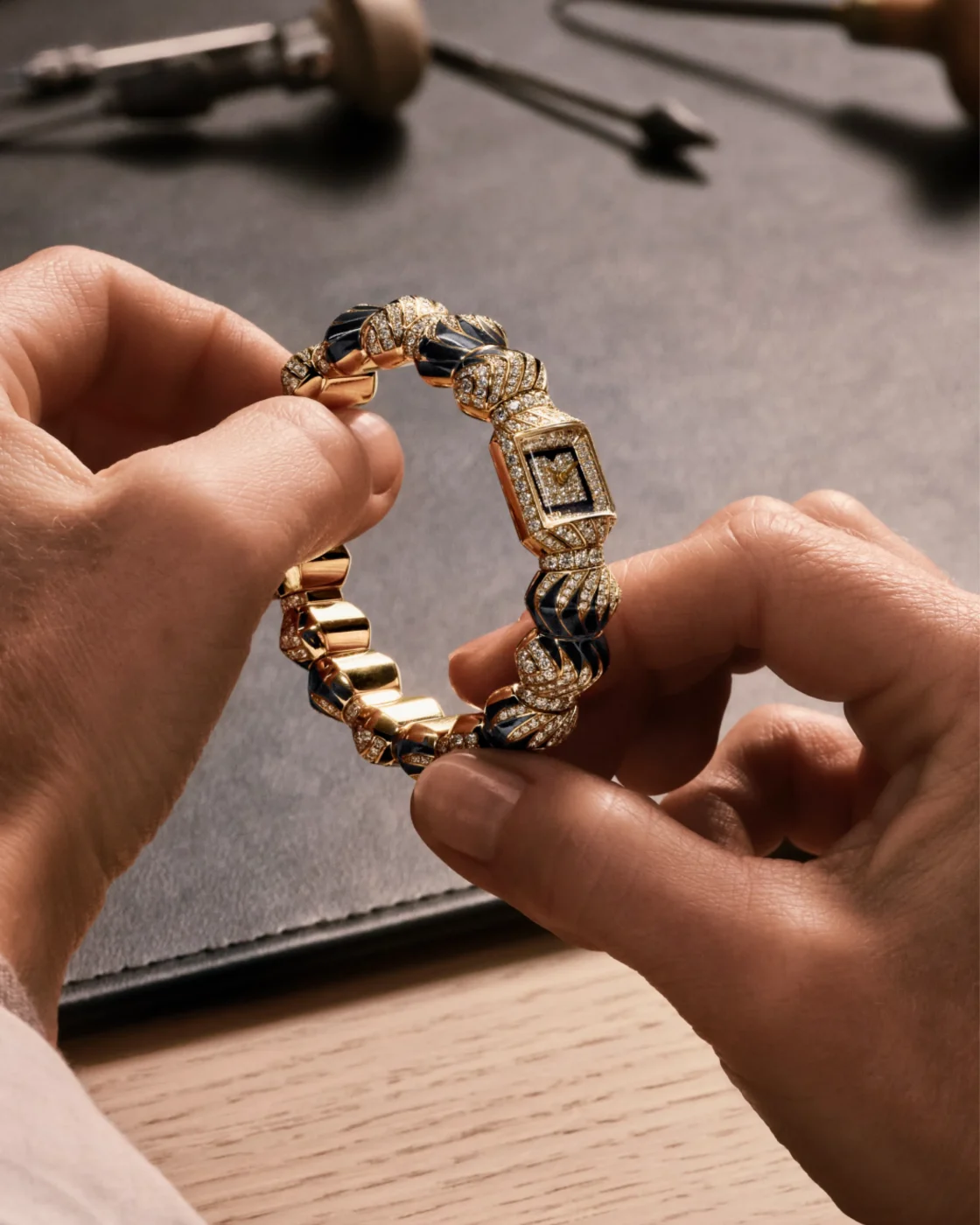 The yellow gold version pairs 634 brilliant-cut diamonds (6.13 carats) with hand-painted black lacquer lines from the Maison des Métiers d’Art. Thirty hours of setting work for the bead setting alone.
