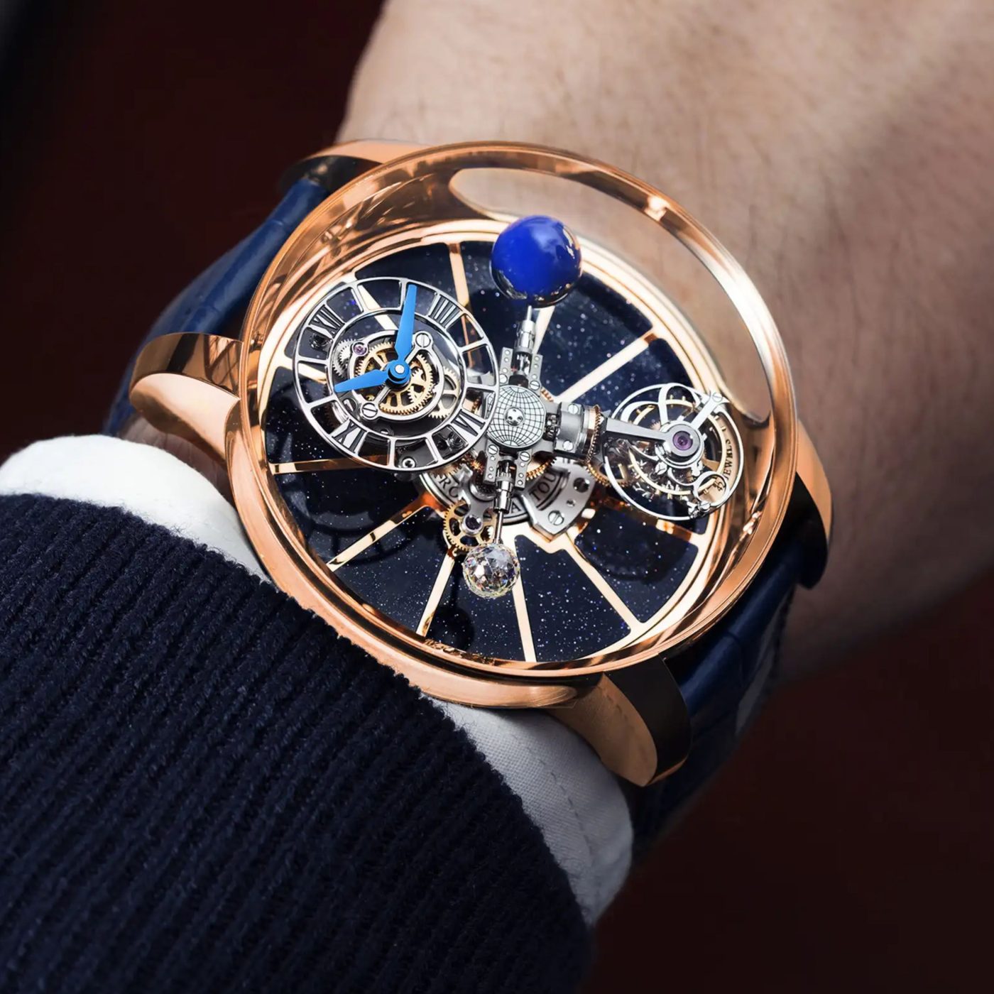 Jacob & Co. Astronomia Tourbillon: a theatrical hand-wound creation where the Earth, Moon, and tourbillon all orbit the dial in constant motion. Image: Jacob & Co.