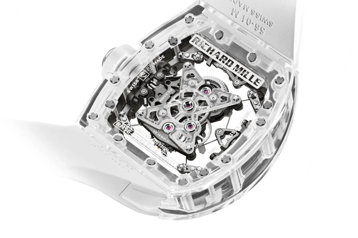 RM 56-02 movement detail, a hand-wound calibre floats mid-air inside the transparent sapphire case, powered entirely by human energy. Image: Richard Mille