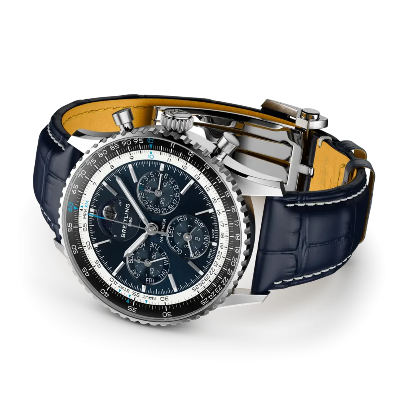 At 43mm across and 14.94mm thick, the platinum case tips the scales at 108 grams without the strap. That is heavy, but not absurdly so for platinum, and the proportions stay within the Navitimer’s familiar silhouette.