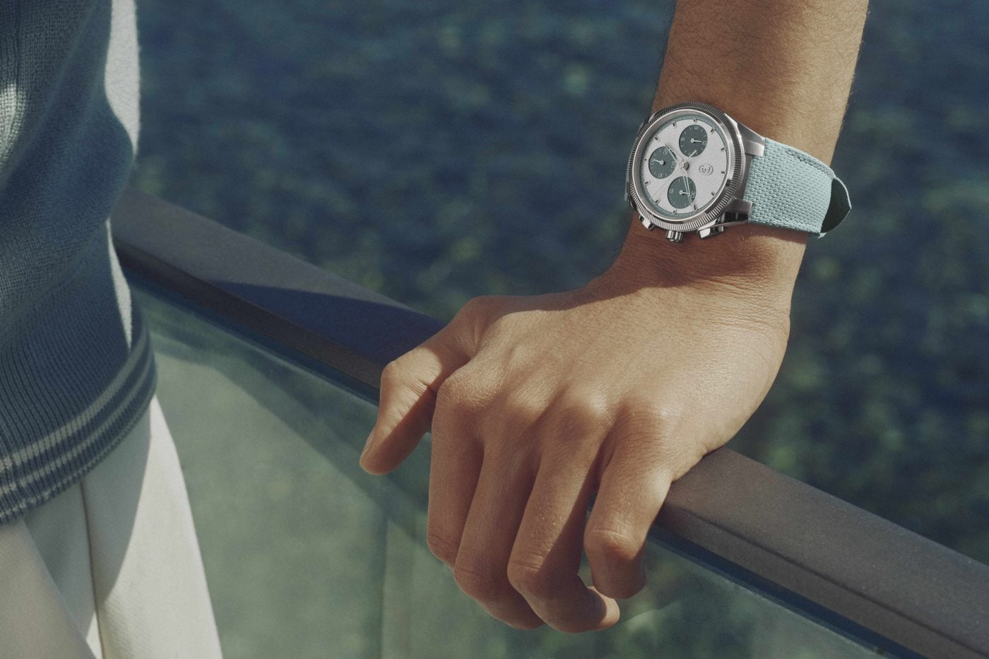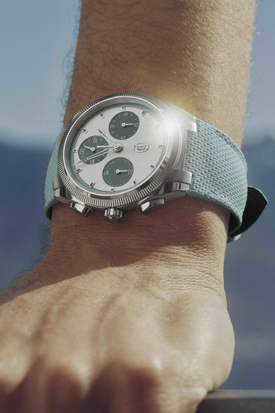 The “Silver Verzasca” pairs a silver guilloché dial with teal-green sub-dials and a matching rubber strap, all powered by the brand’s in-house 5 Hz chronograph calibre. It’s a summer watch from a brand that doesn’t shout, and that’s exactly why it works.